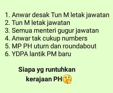 3) DSAI,LGE,Nipa tak semenggah,Mat Sabu dan kesemua pemimpin PH mula pujuk atok untuk jangan letak jawatan. Alasan atok? Nak buat unity goverment..piiirrraaahhh dengan unity goverment dia..then, bila YDPA minta dewan rakyat untuk hantar 1 nama yg mungkin mendapat sokongan majoriti ahli dewan rakyat, PH ni punya bijak tahap cipan, boleh suggest nama DSAI..oiii, kalo PH tetap dengan pendirian untuk sokong atok, PH masih lagi menjadi kerajaan hari ni la ngokkk. Punya bingai lah DSAI ni,dia masih tak faham dengan atok punya game.